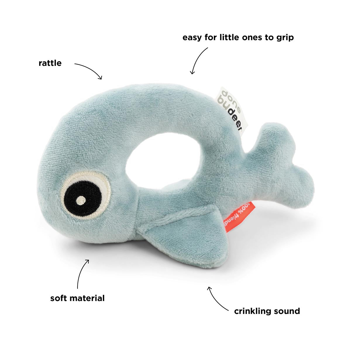 The soft ring rattle makes a cute rattle sound when it's being shaken and the fins make a funny crinkle sound when touched.