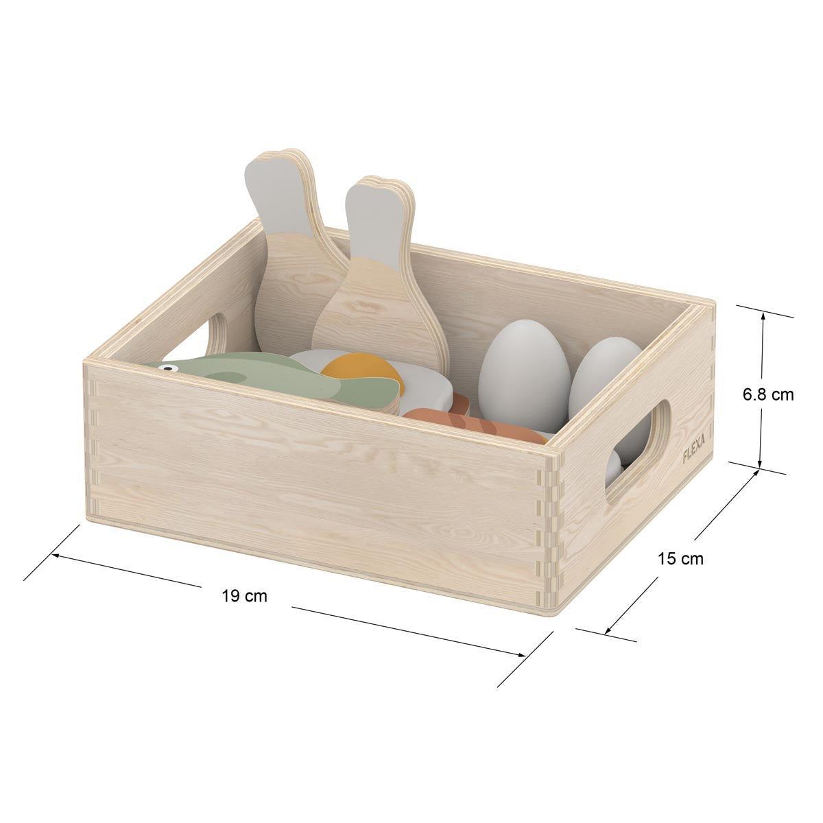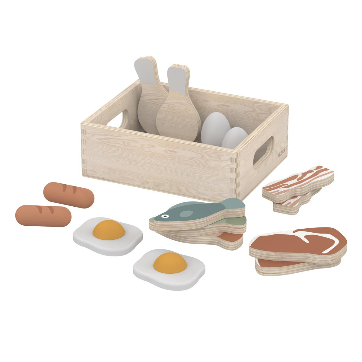 - the 7 piece set includes; steak, fish, fried and boiled eggs, bacon, sausages, chicken drumsticks and 1 wooden storage crate