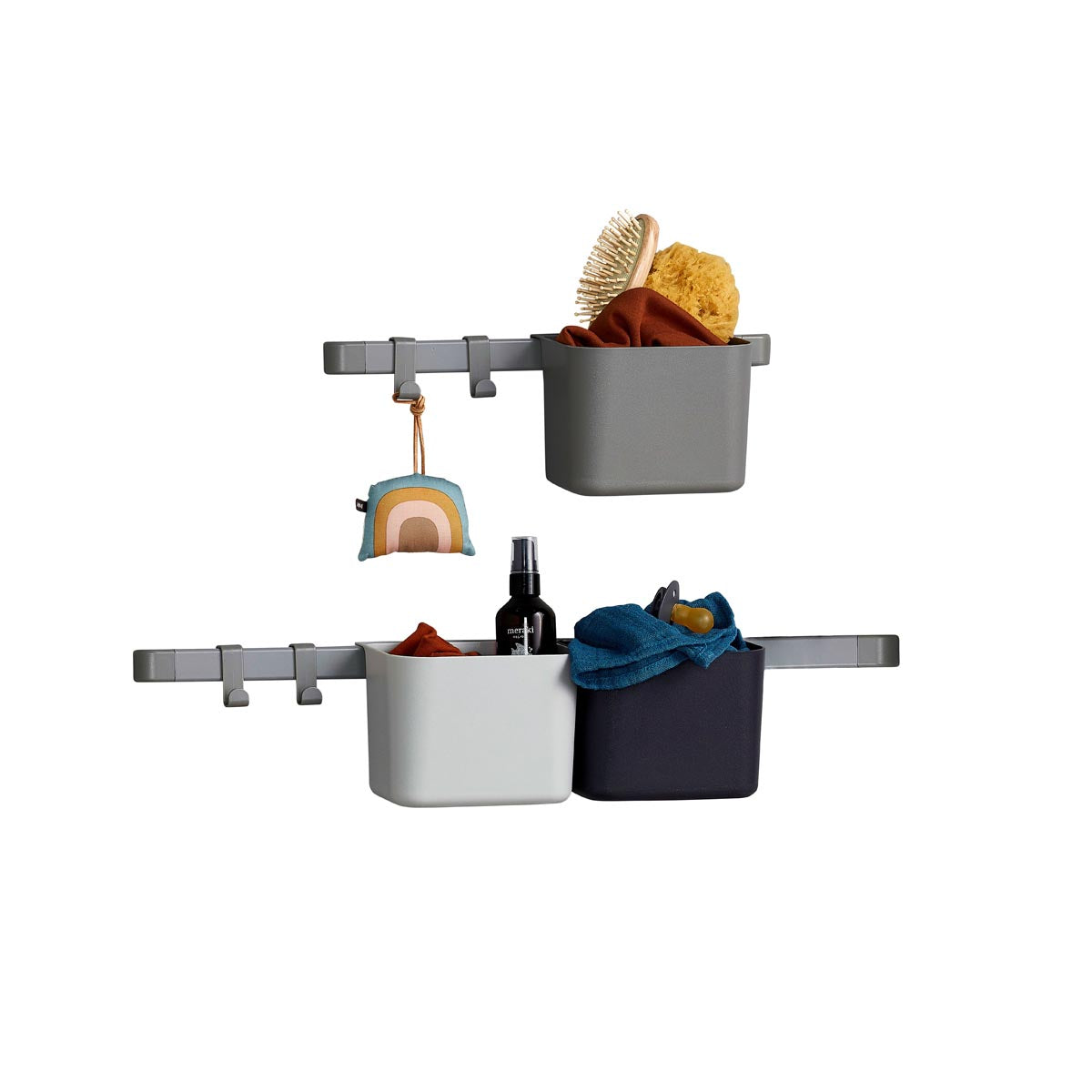• includes 3 detachable storage containers, 4 hooks and a long and short rail for mounting to the wall