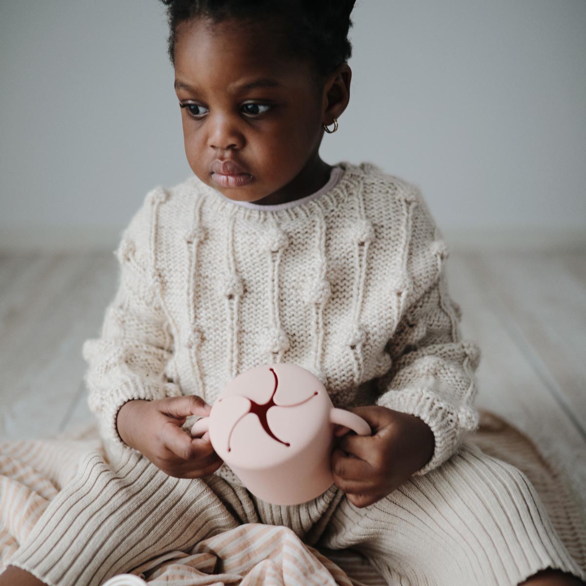 Designed with two small handles for an easy grip for little hands, Mushie's silicone snack cup is spill-proof for any baby to take on the go.